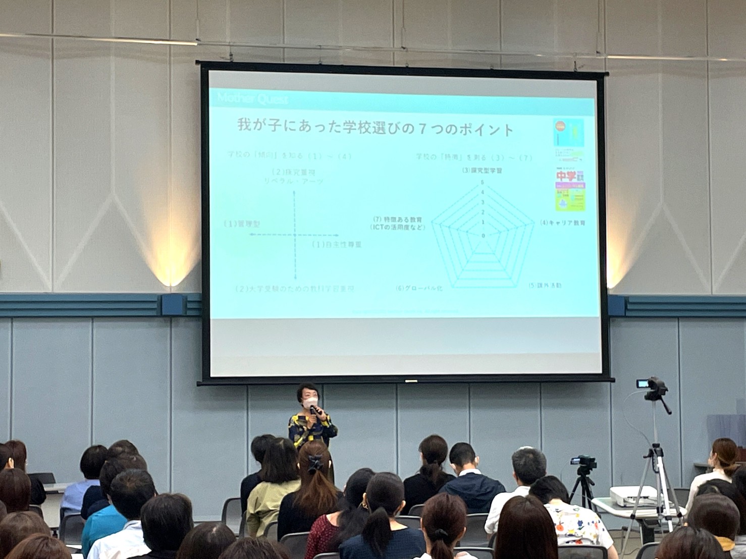 写真:芝国際(現・東京女子学園)中学校高等学校会場【三田NNホール】で実施した マザークエスト主催 教育ジャーナリスト 中曽根陽子さんによる講演