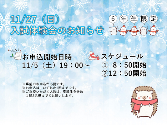6年生限定で、午前、午後、同内容で2回開催されます(お申し込みはどちらか一方で)。
