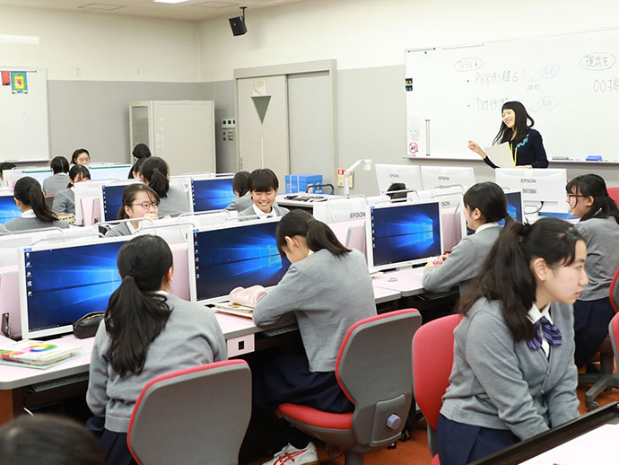 また、跡見学園では「発信」にこだわっています。授業内でのグループワーク、調べ学習やプレゼンテーションを通じて、生徒が主体的に「発信」をします。これは、変化の幅も方向性も見通せない社会で、常に自分自身をプロデュースできる「しなやかで凛とした女性」を育てることにつながっています。