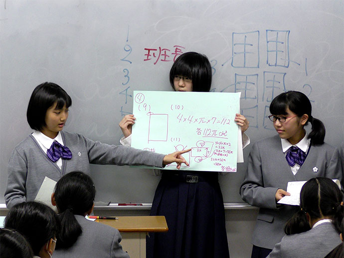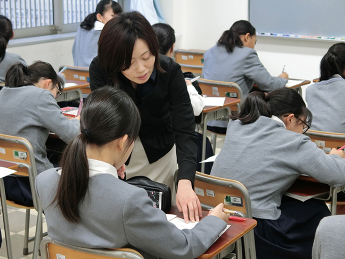跡見学園では、生徒が主役になる質の高い授業を実現するために「授業診断」を実施しています。教員がお互いの授業を点検、「生徒に考えさせる」ことを主眼においたアクティブな授業を目指しています。教科の枠組みをこえて実施しており、教員の教育への熱意を感じる取り組みです。