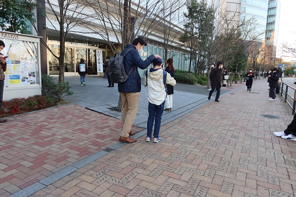 7時20分を過ぎた頃から受験生たちが集まりだし、ピークは7時45〜50分頃でした。中には正面エントランスの手前で、オンラインにて塾の先生に激励されている受験生もいました。