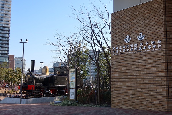 豊洲駅から豊洲市場方面へゆりかもめに沿って向かうと学校に到着しますが、ゲート入り口の横には創立100周年記念事業により保存展示されている蒸気機関車が鎮座しています。