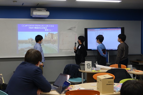 自己紹介などの後に話し合ったテーマは「◯◯が“ワクワク・ドキドキ”でいっぱいになる『知的で開放的な広場』を提案せよ!」。