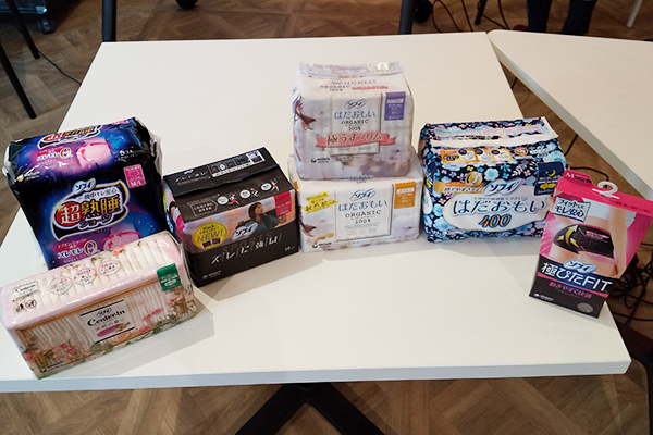 みんなの緊張感が解けてきたところで、生理の基礎知識について講義が始まります。話が進む中で、開始前から机の上に置かれた生理に使用する商品を実際に手に取ってみます。女子生徒も「これは知らない」、「使ったことがない」という声もあり新たな発見があったようです。タンポンやナプキンはどれくらい吸水するのかを実物を使って体験していきます。