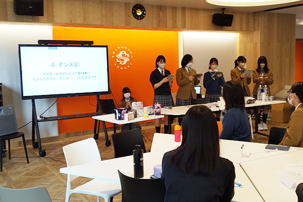 司会メンバーとユニ・チャームの和田さんからご挨拶がありました。その後、アイスブレイクのクイズタイムに続きます。品川女子学院・品川翔英の両校からクイズを出し合います。品川女子学院からは3問出題されました。「品女の部活で一番盛んなのは?」「CLAIR.のロゴはどれ?」「制服はどれ?」