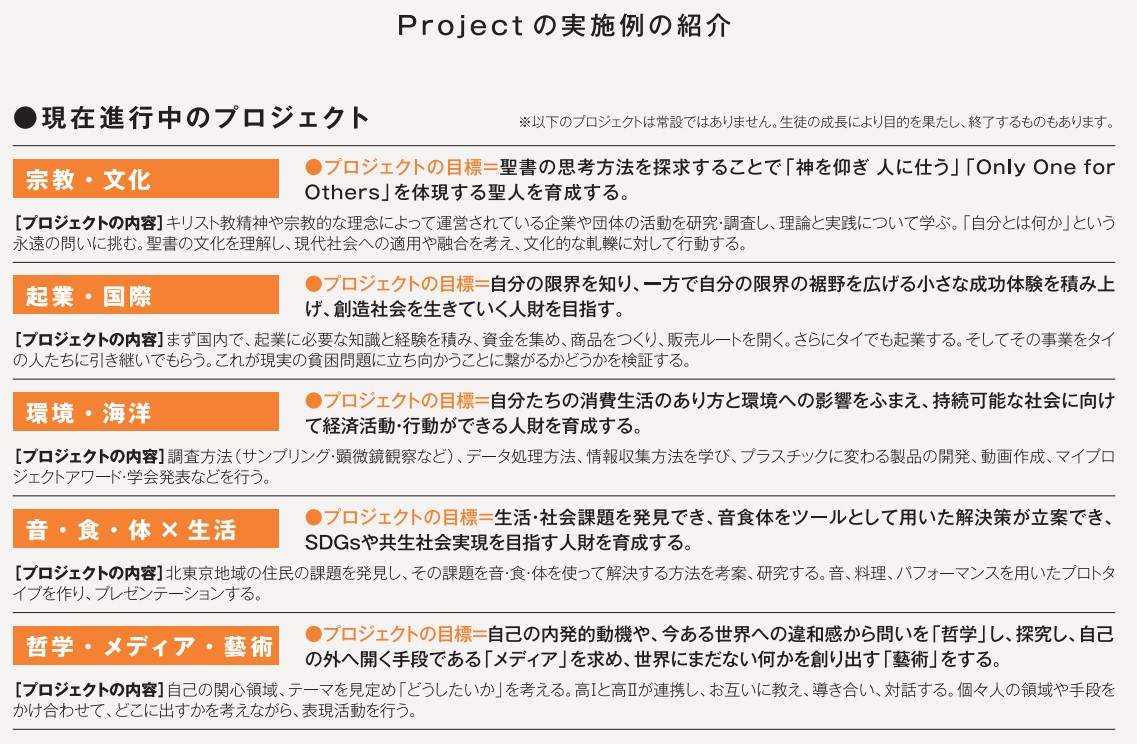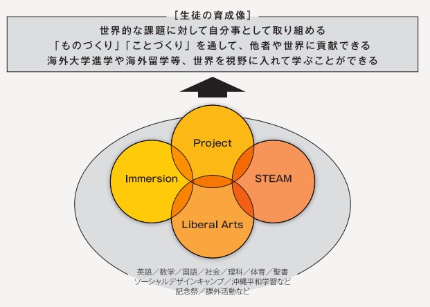 世界のために、ものづくり・ことづくりで貢献できる、新時代の「Only One」「for Others」を目指しています。このクラスでは、学校独自設定科目として「イマージョン」「STEAM」「プロジェクト」を設置し、より良い世界の実現に向けて、クリエイティブな方策や新たな価値を創出するグローバルイノベーターを育成していきます。また、教科を横断した学びの土台として「リベラルアーツ」を学び、思考・探究の基礎を身につけます。