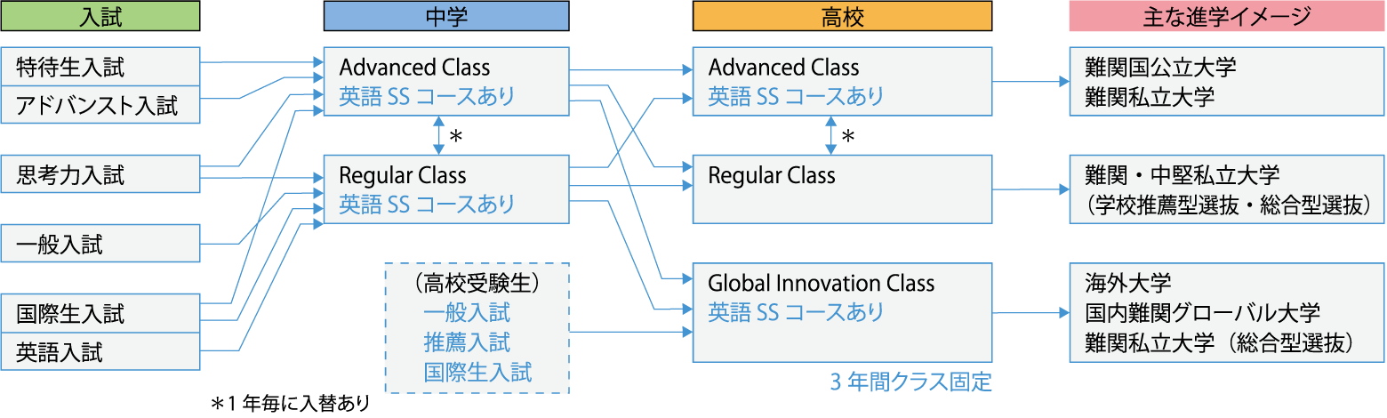 クラス編成は、難関国公立大や難関私立大(早慶上理ICU+GMARCH)進学を目指す「Advanced Classアドバンスドクラス」、難関・中堅私立大学(学校推薦型選抜/総合型選抜)を目指す「Regular Classレギュラークラス」、海外大学や国内難関グローバル大学などを目指す「Global Innovation Classグローバルイノベーションクラス」があります。高校受験では、「Global Innovation Classグローバルイノベーションクラス」のみ募集いたします。