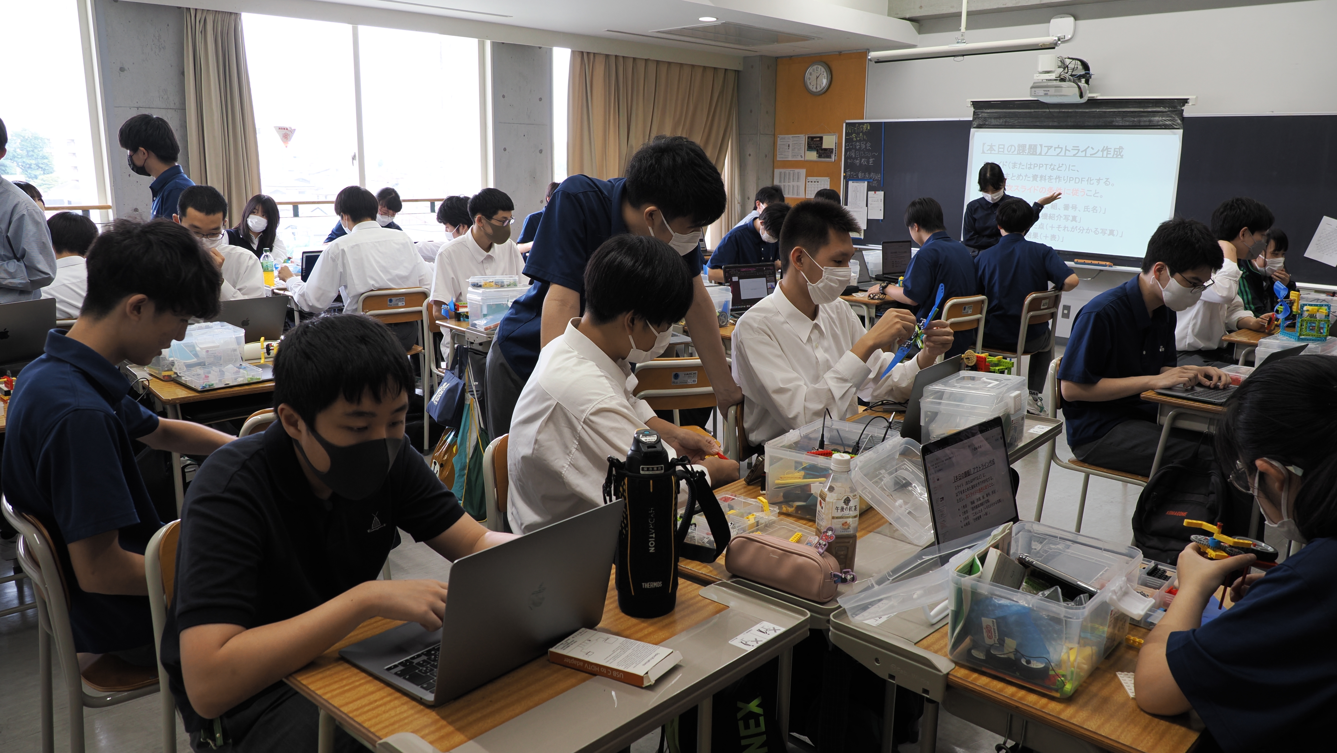 扇風機のモデル制作とプログラミング制御を行い、その回転数を計測し動画とともに報告書を提出するという流れでした。この一連の流れを経験することで、発想力・試行錯誤力・要約力・資料作成力などさまざまな力を養うことができます。この理系先進コースが創られた当初から、学力だけでなく探究力もつけるということを意識してカリキュラムを組んできたとのことです。2限続けての授業でしたが、生徒たちはみなずっと集中して取り組んでいました。