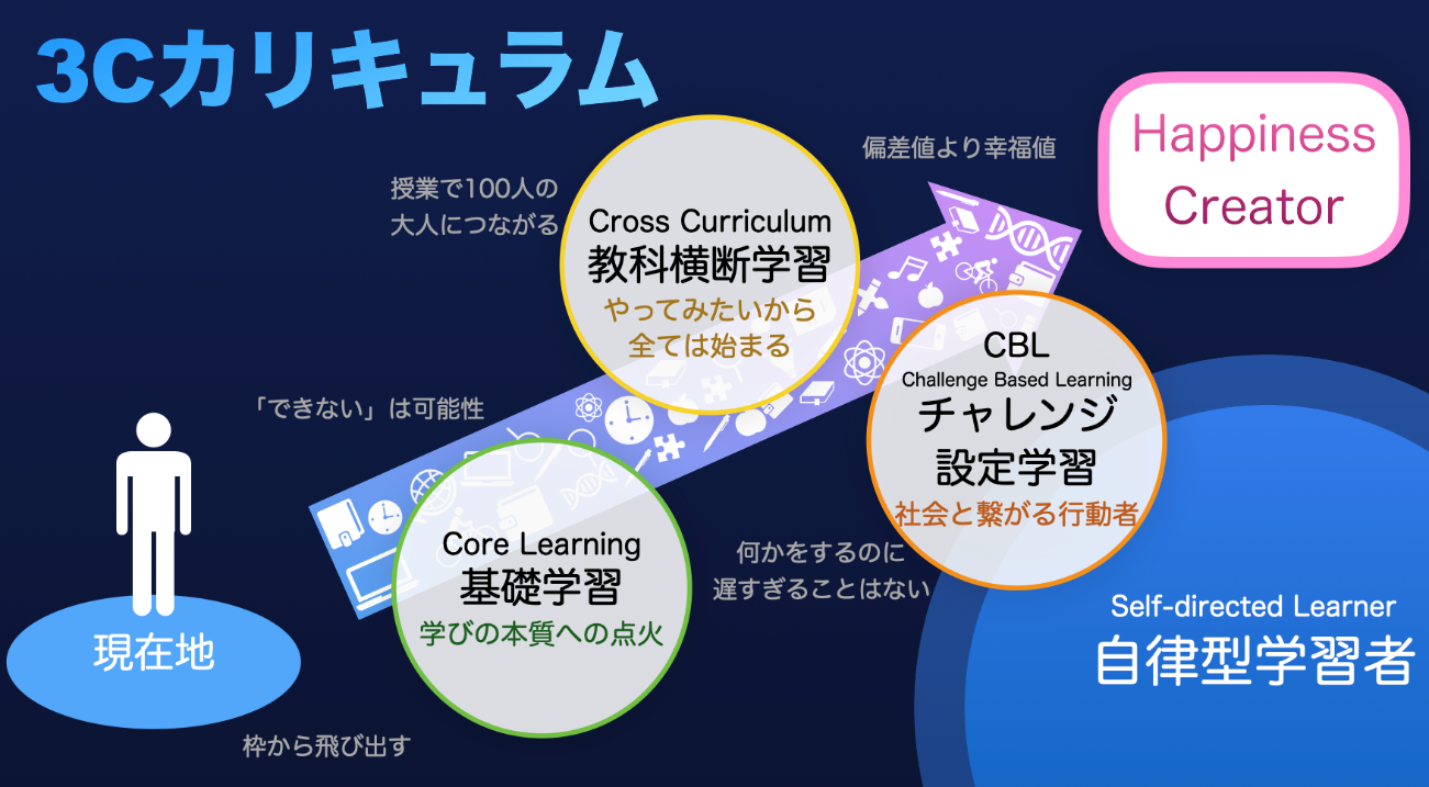 不安定な未来を生き抜くための基礎力を養う教科学習(Core Learning)は、AI等を用いて個別最適化されており、それぞれの120%を目指しています。また、教科を横断した広い視野で物事を捉える力を養う教科横断授業(Cross Curriculum)は、「好きなこと」や「自分の関心」から始まる探究学習として、毎週水曜日、丸一日を使って実施しています。そういった学びがさらに発展した学びがチャレンジ設定学習(Challenge Based Learning)で、新渡戸文化の生徒たちはそれぞれの学びや問いから始まる社会課題に挑戦しています。これらの頭文字をとった新渡戸の3Cカリキュラムは、Happiness Creatorを目指した生涯にわたって学び続ける「自律型学習者」を育てる独特なカリキュラムといえるでしょう。