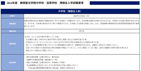 静岡聖光学院の帰国生入試(11月26日実施)の出願が10月23日にスタートしました。
