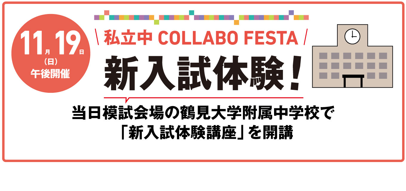 また、同じ11/19(日)「適性検査型模試」の終了後には、同じ鶴見大学附属中高会場にて13:50から、私立中の「適性検査型模試」をはじめとした「新タイプ入試」を体験できるイベント「新入試体験!私立中コラボフェスタ」が開催されます。