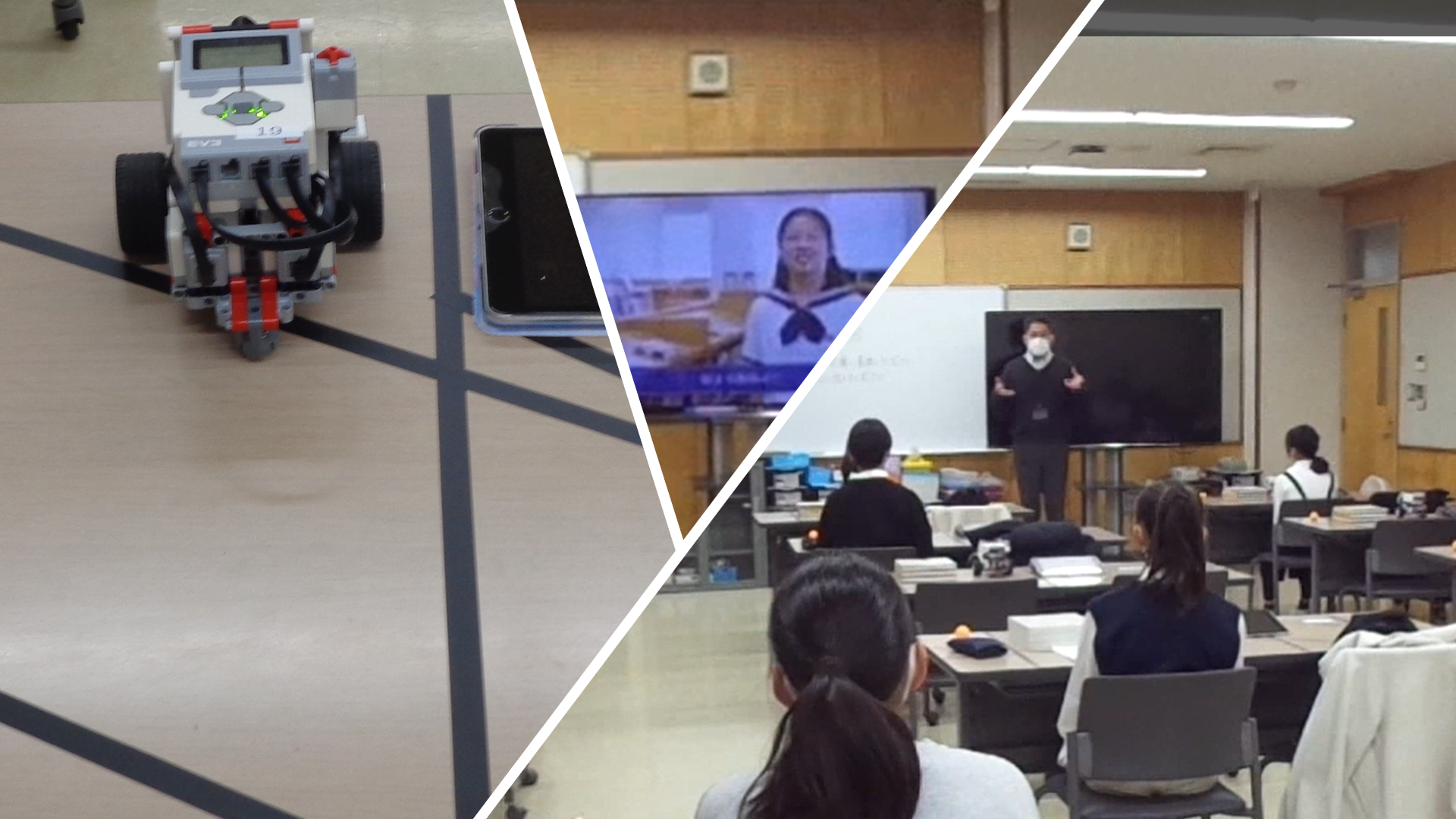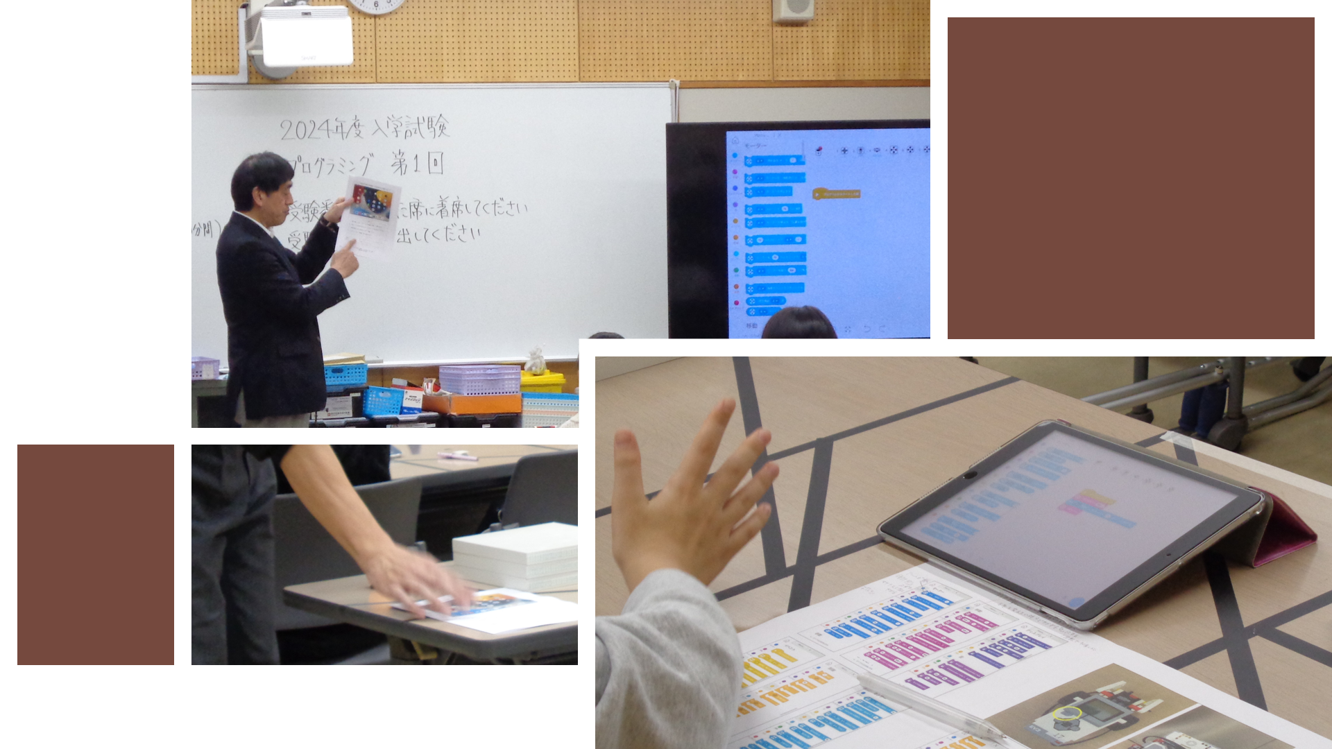 プログラミング入試の試験会場は「多目的教室」になります。机の上には、組立済の車型ロボット、車型ロボットを操作するためのiPadなど、試験で使用することになる道具がすでに準備されています。集合時間の8時30分まで、在校生から受験生へのメッセージ動画やBGMが流れていて、受験生がリラックスしやすいように配慮されていました。今年の『第1回プログラミング入試』は、昨年と同数の受験生13名でした。