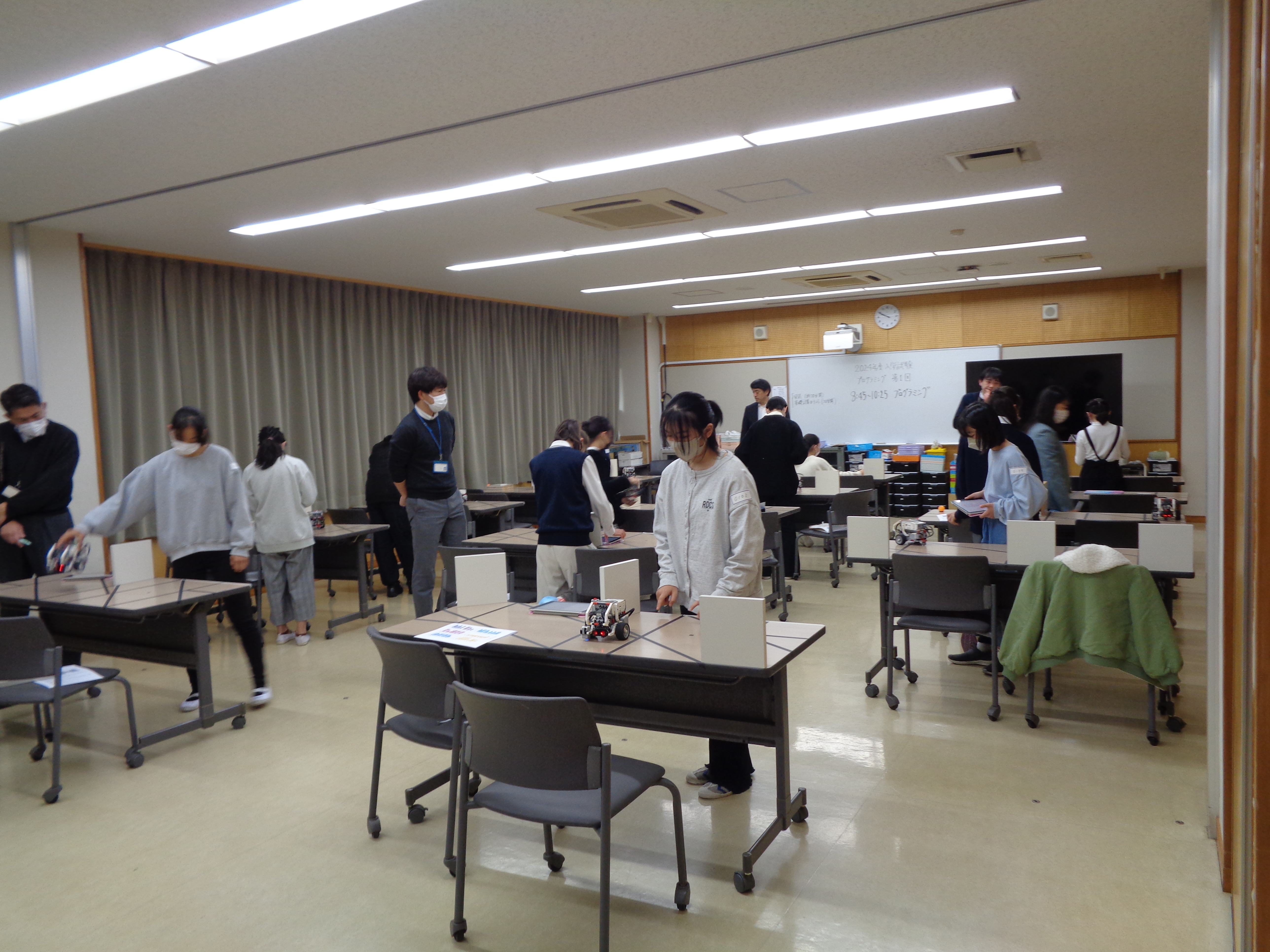 受験生の設定がうまくいかなくて困っていたり、車型ロボットが反応が悪い場合は、周りにいる試験監督の先生方が対応されていました。