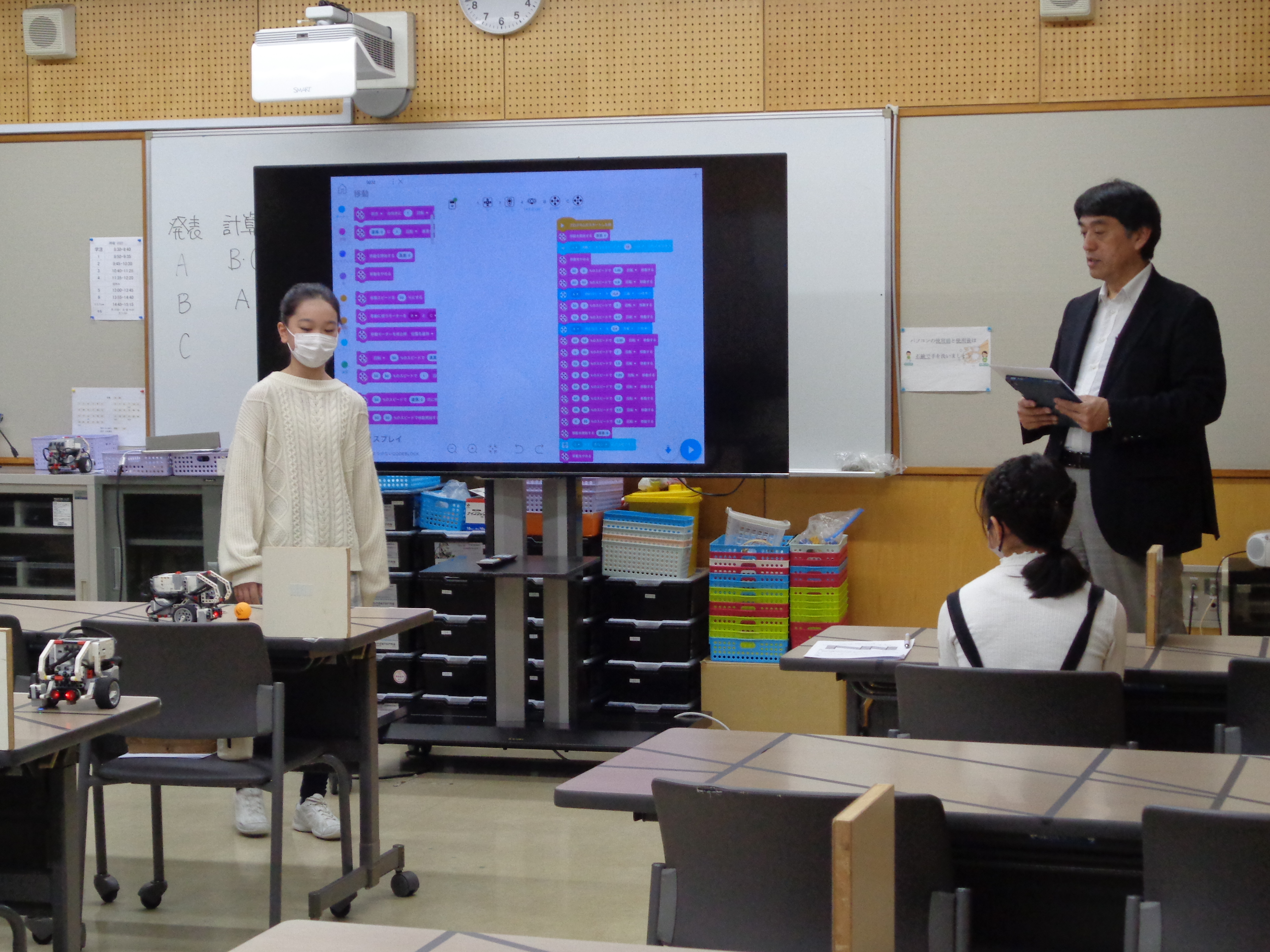 プログラミング終了後、1グループ4〜5名の3グループに分けて、プレゼンテーション(20分程度)と基礎計算力テスト(20分)を順番に行います。プレゼンテーションするグループはそのまま教室に残り、それ以外のグループは基礎計算力テストを行う別の教室に移動します。