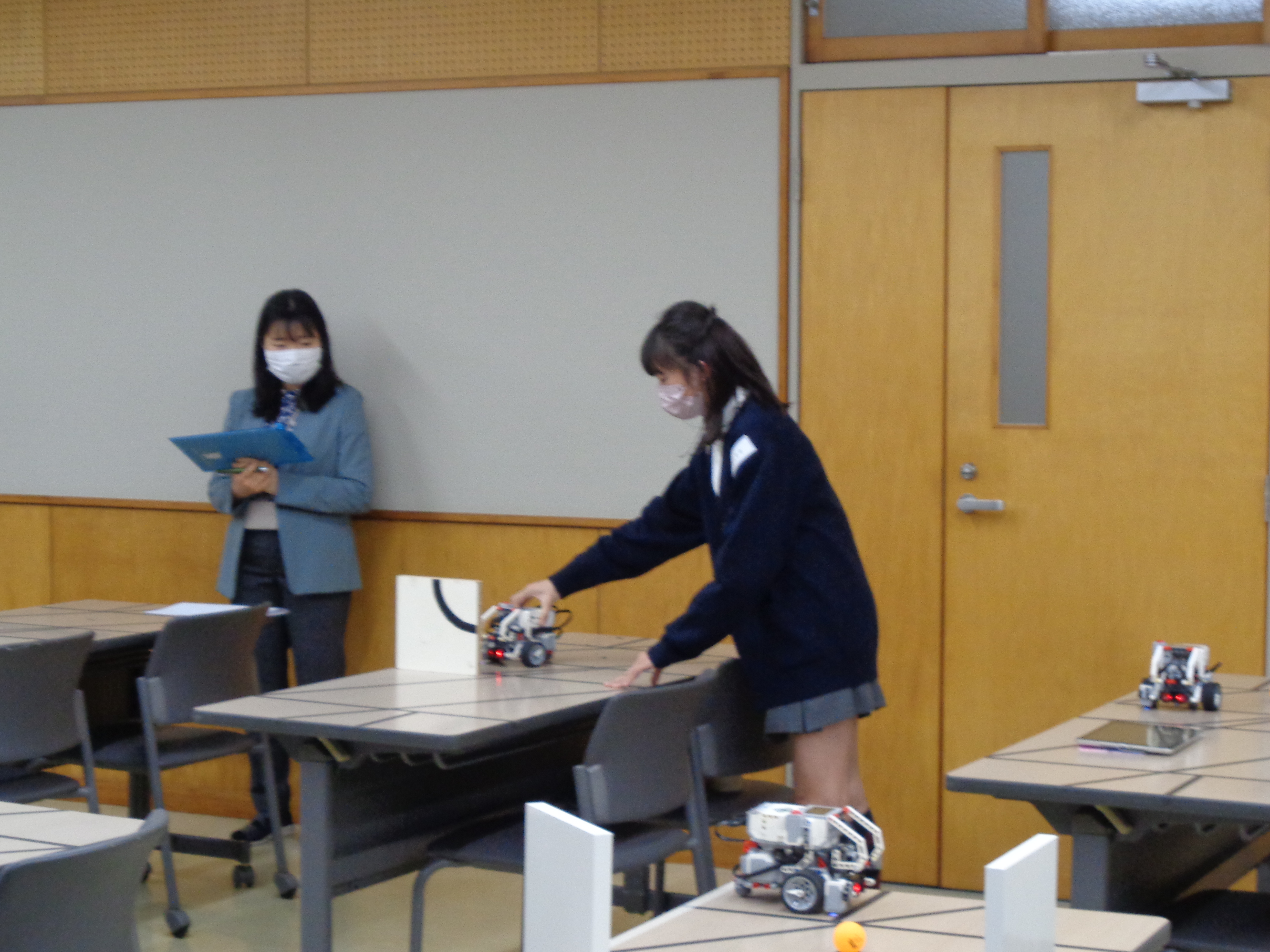・上記2つの課題をあわせて、障害物をよけたりピンポン玉を落として、スタート地点からゴール地点まで車型ロボットを移動させる。
