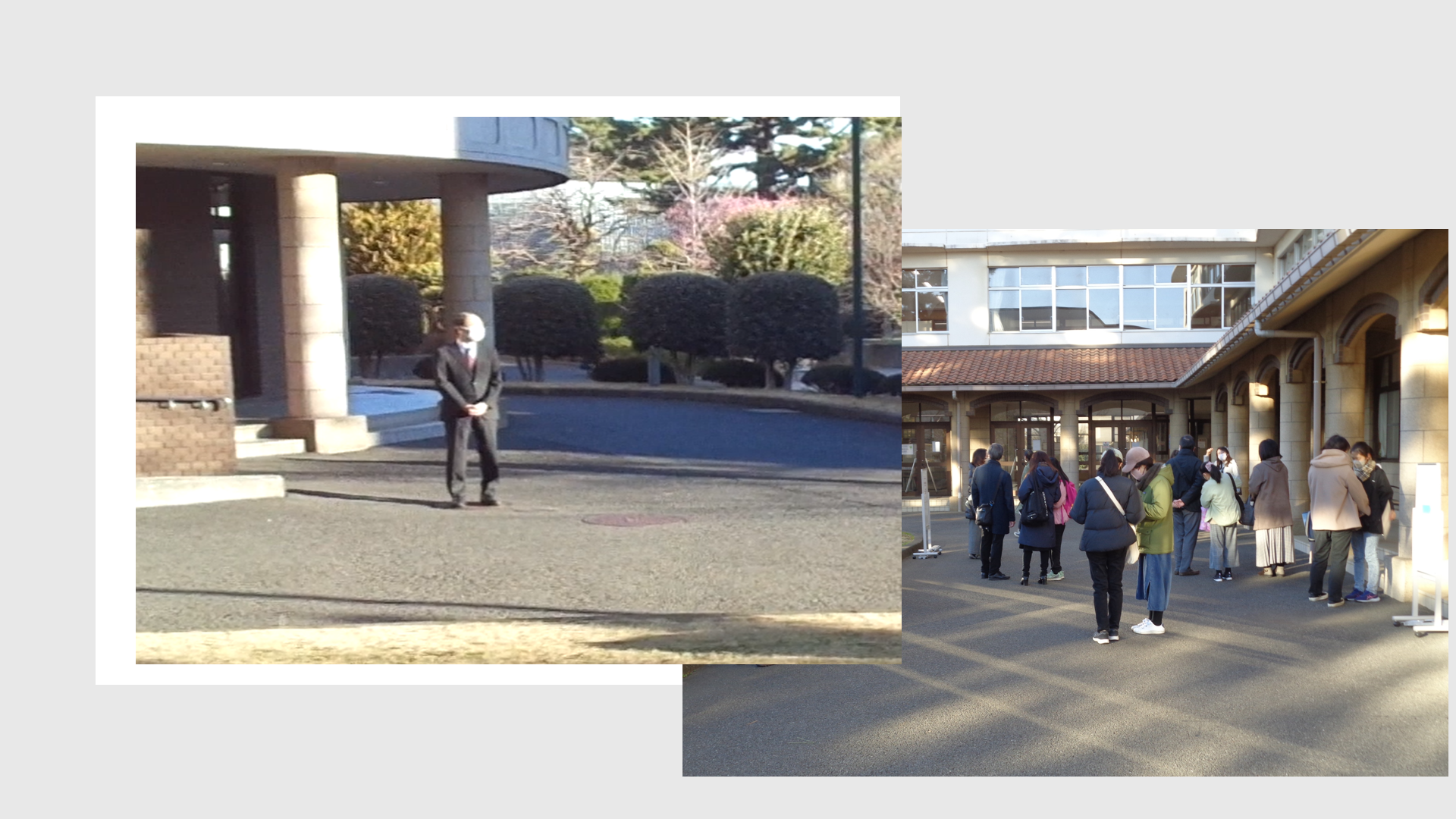 この日、校舎内に入れることができる開場時間は、集合時間の1時間前となる午前7時30分。朝から晴れわたり、この時期としては暖かさを感じる中、7時30分すぎに受験生と保護者の姿が見え始めました。校舎前では、学校長の武石輝久先生が受験生と保護者を出迎えていました。