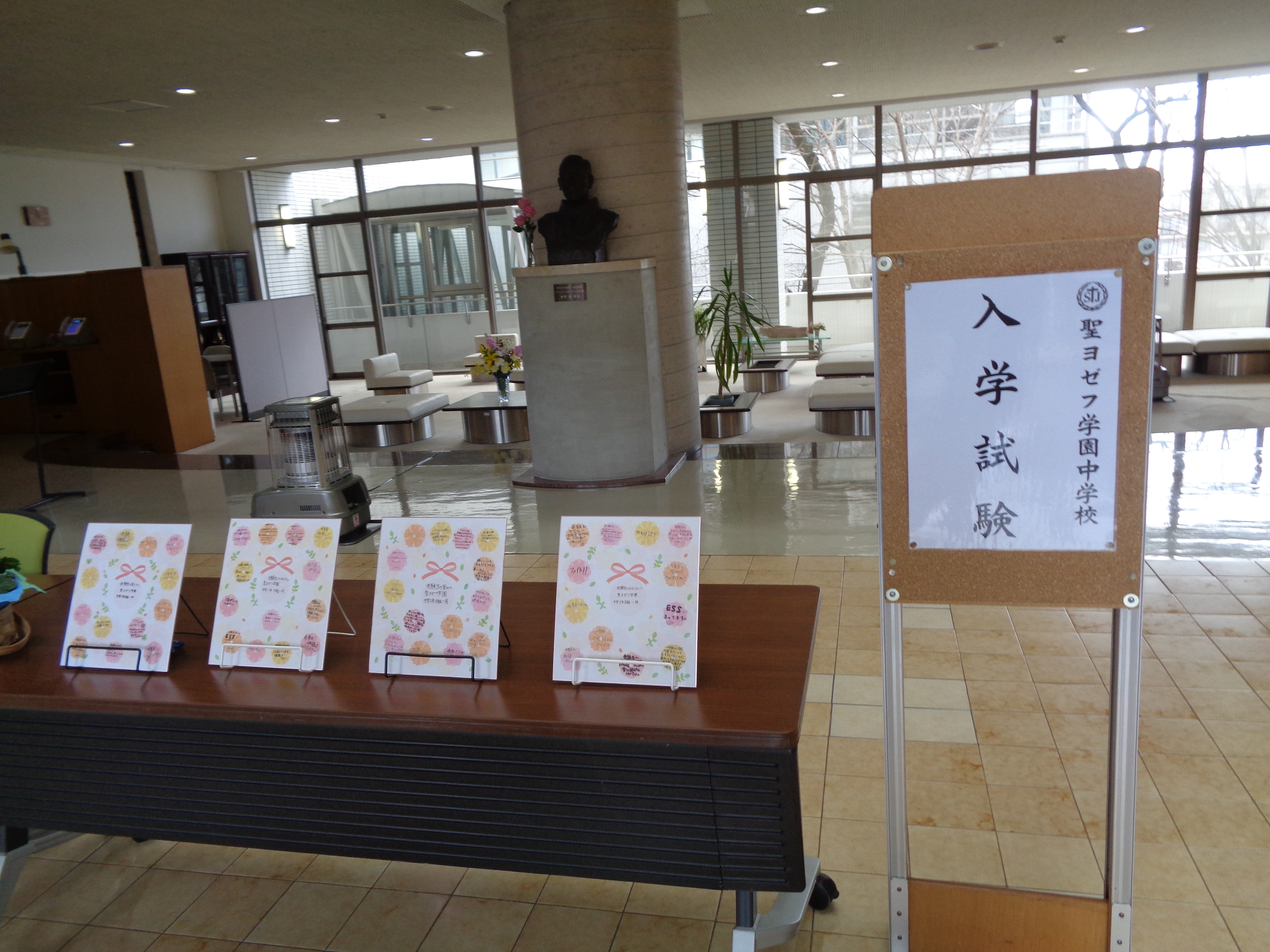 『総合・グループワーク型入試』の集合時間は14時30分。春のような暖かさの中、16名の受験生と保護者の方が同校を訪れました。校門をくぐり校舎入り口では、高校3年生の在校生と先生方が出迎えてくれます。受付には、在校生が受験生に向けたメッセージが飾られていました。中学入試委員長の熊澤正勝先生によると、この在校生のメッセージを印刷したものと先生方のメッセージカードが入試前に受験生へ送られているそうです。受験生は嬉しかったに違いありません。