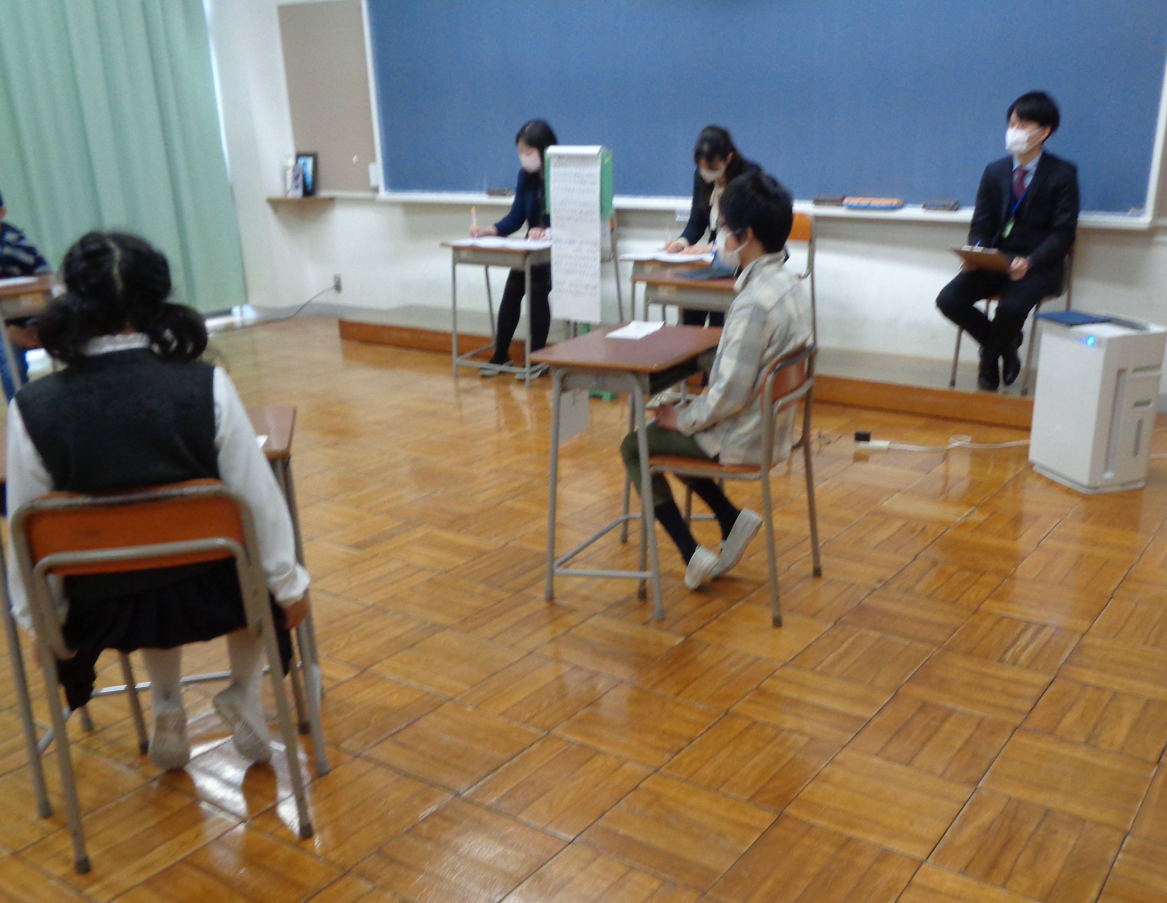 今年の個人質問は、「最近、あなたの学校のどの教室でもゴミの分別がきちんとできていません。そのため、どうしたら小学校1年生から6年生までの全学年がしっかりゴミの分別ができるようになるか、最上級生の6年生が考えることになりました。ゴミの分別をきちんと行うために、どのようなことを行ったらよいと思いますか。理由とともに答えてください。」という内容でした。1人1分ほどで理由や考えを述べます。