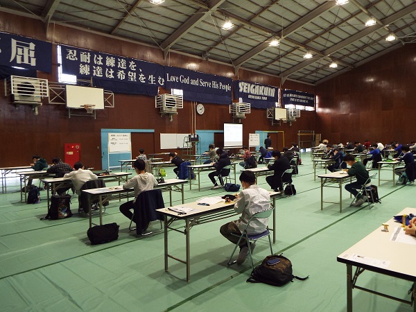 それでも、2月の午後はまだ外気は冷えるのと、最初の「思考力」試験は80分間という長丁場ということもあり、試験開始の15時の少し前にもう一度「トイレに行きたい人は、いま案内します」とアナウンスされ、体育館後方のドアから、数名の受験生が先生に案内されて行きました。