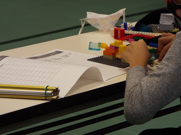 問題用紙と資料に向き合うと、すぐにレゴブロックをいくつか手に取ってプレート上に作品の一部をつくり始める受験生や、まずはじっくり問題と資料を呼び込んでから初めて手を動かしてレゴを組み立て始める受験生など、やり方の手順は様々なようです。