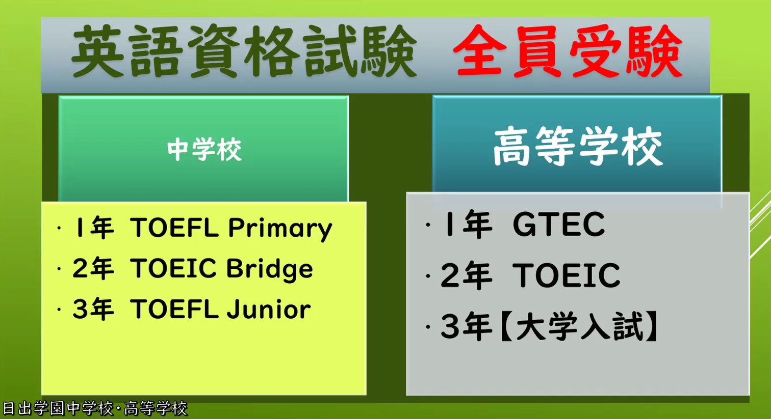 日出学園高等学校は千葉県市川市に位置し、東京、埼玉、神奈川など多くのエリアから生徒が集まるため、ある意味で「グローバル」と言えます。グローバル教育の一環として、毎年2月に「英語資格試験の日」を設けており、全校生徒が英語の資格試験を受験します。高校1年生はGTEC、高校2年生はTOEICを受験し、各自で申し込み希望する大学で受験することも奨励されています。学校は全てをサポートするのではなく、生徒が自分で一歩踏み出すことを奨励しています。