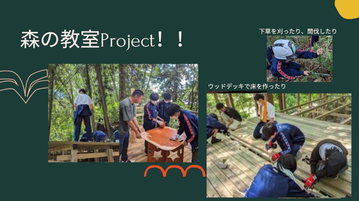 学校林を活用した「PNP(パウロネイチャープログラム)」では、 間伐や、植生について学ぶことを通して里山の保全やあり方を考 えます。また、生徒たちの「森の中で授業を受けたい」との思い から「森の教室」を地域の大人に協力してもらい、現在進行形で 作っています(活動の概要についてまとめたものは「グリーンイン フラネットワークジャパン・ポスターセッション」で全国3位の 奨励賞をいただきました)。