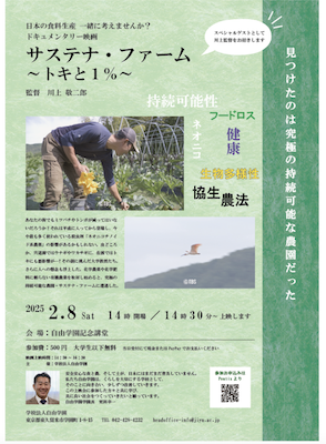 「生活即教育」という理念のもと、独自の教育を展開してきた自由学園では、『サステナ・ファーム〜トキと1%〜』の上映会を開催します。