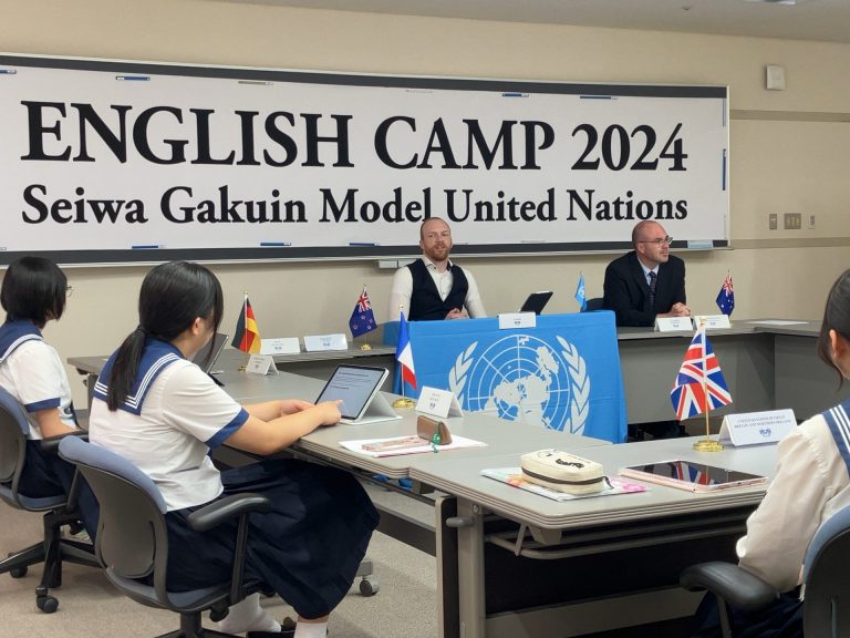 2024年7月19日から開催されたEnglish Campでは、生徒たちが世界の教育課題に挑む決意を開会式で表明しました。初日にはオーストラリアのGriffith大学のAngel講師によるオンライン講座が行われ、国際的な教育問題について学びました。2日目から湘南国際村に移り、「質の高い教育」をテーマに模擬国連の研修が開始。各国の大使として教育水準向上の提案作成とスピーチコンテストが実施されました。3日目には提案内容のリハーサルを行い、最終日に模擬国連の本番が行われました。4日目のクロージングセレモニーでは、講師たちからの称賛と共に生徒たちの成長が評価され、キャンプは大成功を収めました。