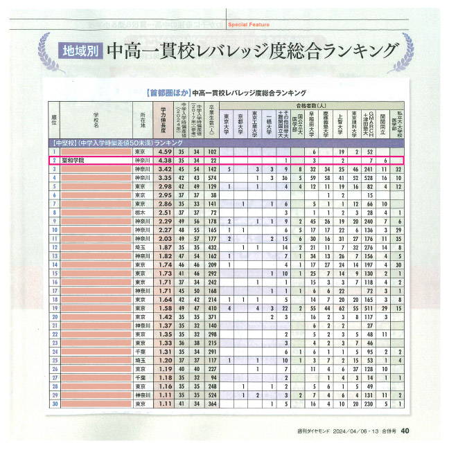 聖和学院は、週刊ダイヤモンドの【中高一貫校 学力伸長度ランキング】において、2年連続で首都圏総合第2位を受賞しました。このランキングは、2023年4月15日・22日号および2024年4月6日・13日号に掲載されました。聖和学院は、英語力の向上だけでなく、グローバル社会で活躍できる人材の育成を目指しています。一人ひとりの生徒と向き合い、共に成長できる環境を提供し続けることを使命としています。この結果は、学院の取り組みが評価されている証拠であり、これからもさらに高い目標を目指していくことでしょう。