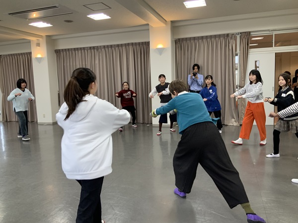 まず、全員で輪になり、先生のリードで、アイスブレイク的に身体を動かす時間から始まりました。最初は硬かった受験生の動きも、小口先生のリードと声かけによって、身体を動かしていくうちに、表情も柔らかになっていきます。