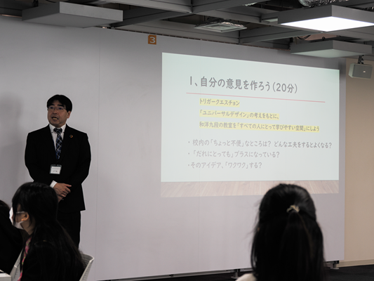 校内探索を終えてフューチャールームに戻ると、新たな課題が発表されました。それが「トリガークエスチョン」。これは、思考を深めるきっかけとなる問いのことで、今回のテーマは 「ユニバーサルデザインの視点を活かして、和洋九段の教室を『すべての人が学びやすい空間』にするにはどうすればよいか?」 というものでした。