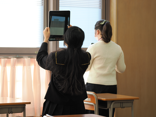 いよいよ校内の探索がスタート。最初に向かったのは、普段授業が行われる一般の教室。それぞれが気になるポイントを見つけ、カメラに収めていきます。受験生たちは、時折意見を交わしながら、真剣な表情で撮影を進めていました。
