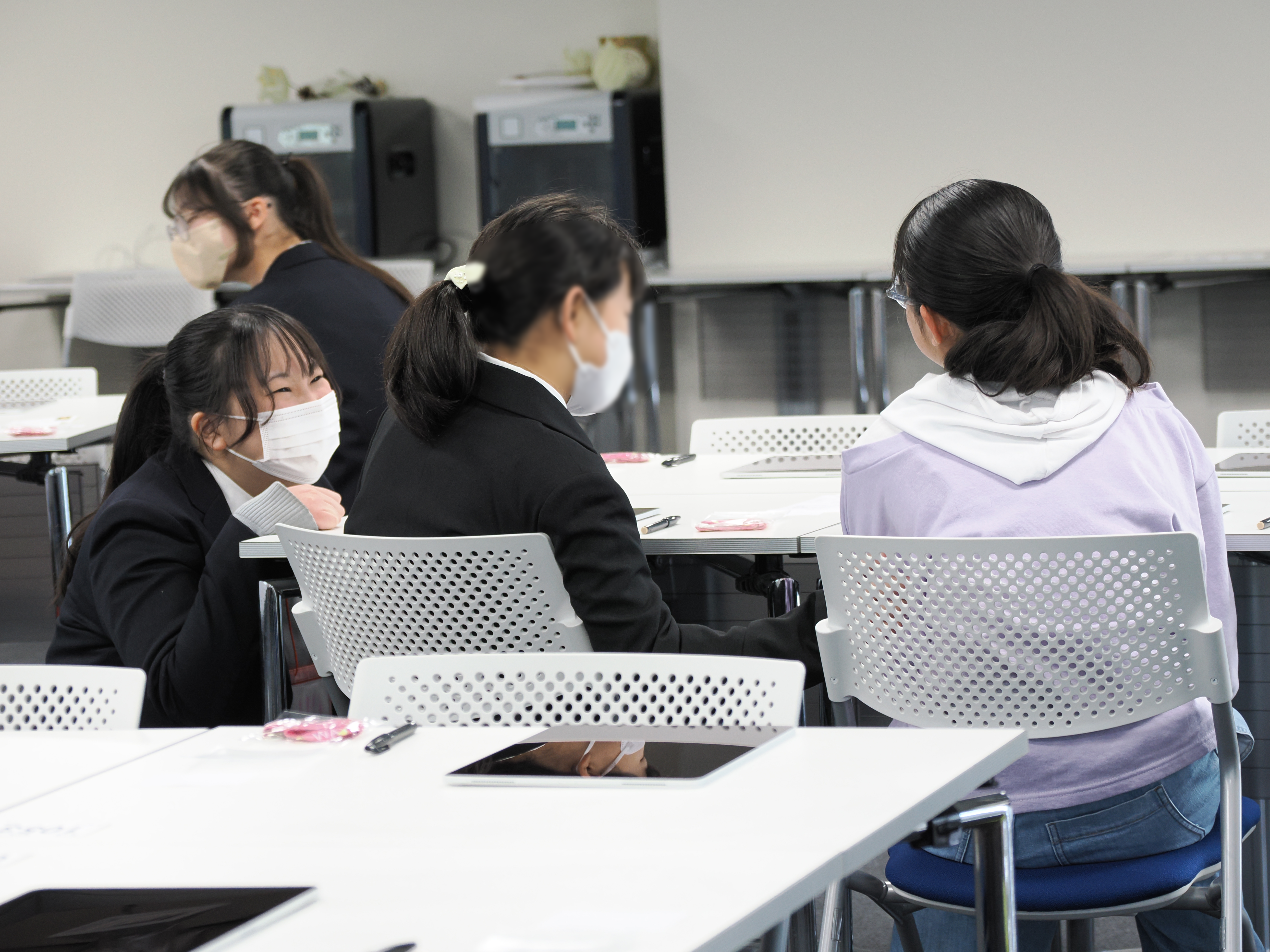 通常の試験ならば、この時間はシーンとしていて、言い知れぬ緊張感が漂っているはずなのですが、ここは全く違います。1グループ4人の席にそれぞれ在校生が1人ずつ付き、積極的に、かつ自然に話しかけ、受験生の緊張をほぐしていきます。集合時間になるころには、全てのグループに笑顔があり、何も話さずうつむいているような受験生は誰一人としていませんでした。