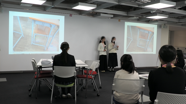 発表が始まると、どのグループも落ち着いた様子で、しっかりと準備した内容を伝えていました。役割分担もきちんとできており、その堂々とした姿に驚かされました。あるグループは、「消火器の位置がわかりにくく、いざというときに取り出しづらいので、より目立つ場所に設置すべき」と指摘。また別のグループは、「成長に合わせて机や椅子の高さを調整できるようにした方がいい」と提案し、小学生ならではの視点が光る発表が次々と続きました。