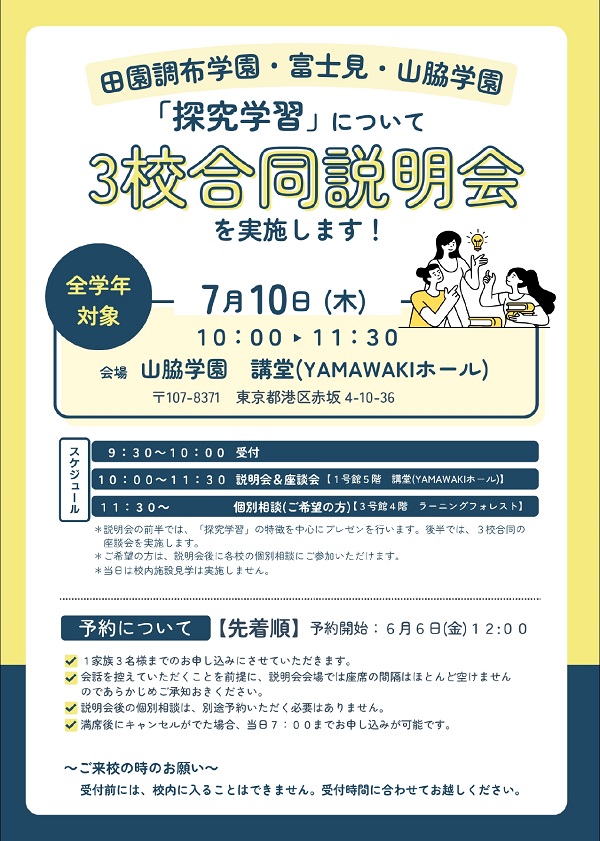 田園調布×富士見×山脇!探究学習についての3校合同学校説明会が7/10に開催!