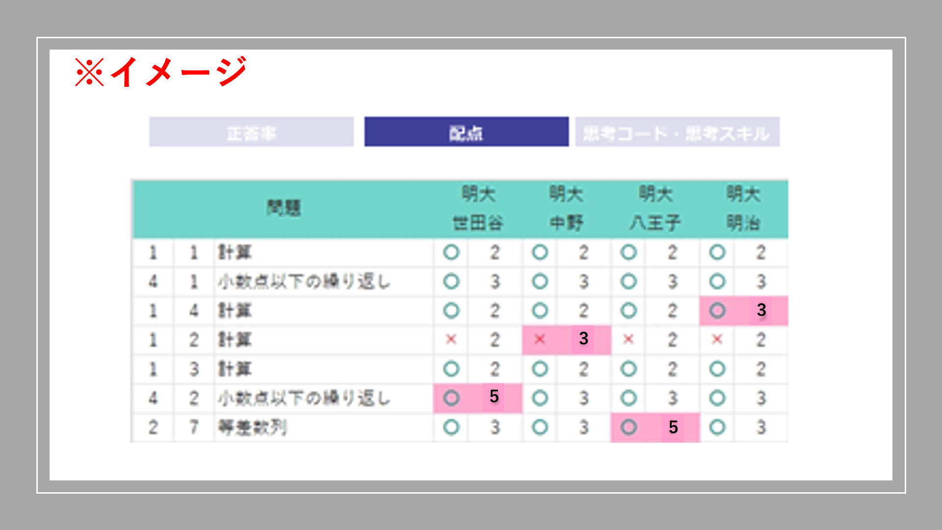 各科目のテスト問題の中に各校の出題傾向にそった問題が散りばめられ、各校の出題傾向にそった問題は、その出題傾向に該当する学校にあわせて配点が高くなります。ですので、合格判定時の各校の設問の配点が変わり、1種類のテストで男子は4校、女子は3校の合格判定がわかります。