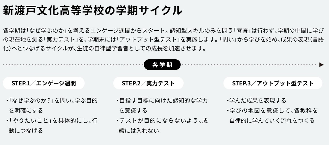 新渡戸文化の学期サイクルは、各学期の初めに「なぜ学ぶのか」を問い直す「エンゲージ週間」から始まります。この期間は、生徒が学びの目的を明確にし、具体的な行動につなげるための重要な時間です。学期中には、認知型スキルを問う「考査」は行わず、学びの進捗を測る「実力テスト」と、学期末には「アウトプット型テスト」が実施されます。