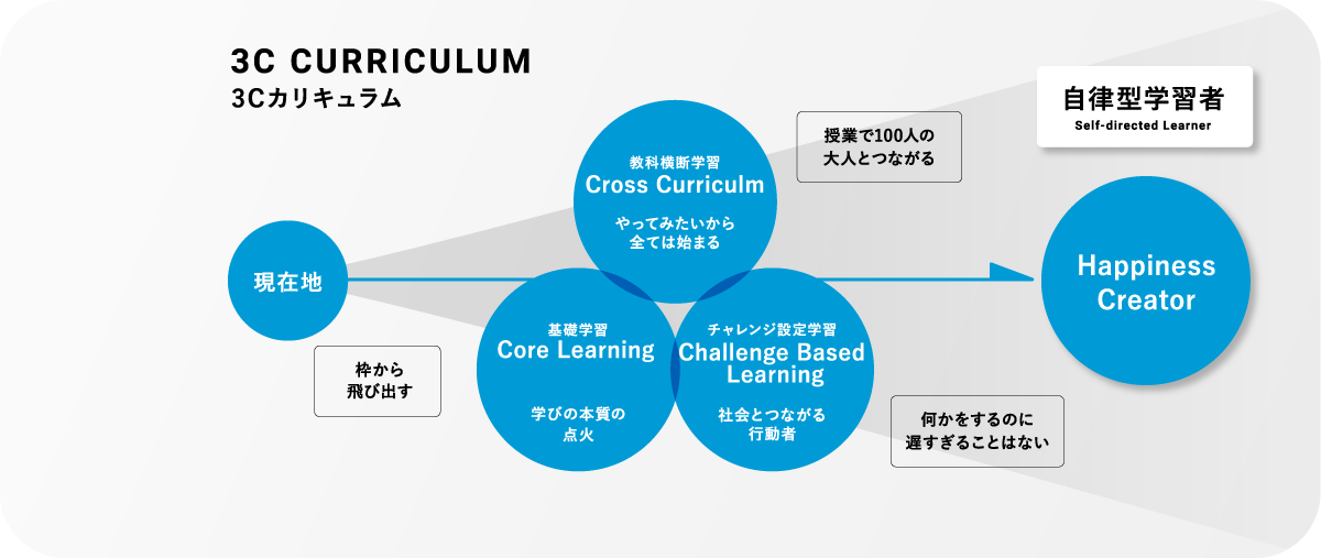 新渡戸文化は「自律型学習者の育成」を教育方針として掲げています。この方針を実現するために、「3Cカリキュラム」を導入しています。このカリキュラムは、基礎学習<個別最適化学習>(Core Learning)、教科横断型学習(Cross Curriculum)、社会課題に挑戦する学び(Challenge Based Learning)の3つの要素から構成されており、生徒が自らの学びを主体的に進められるように設計されています。