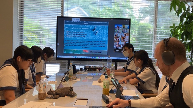 生徒たちは日本とは異なる国の大使として、各国の立場から環境課題を調査・分析し、英語で議論と提案を行います。初日はラーニングコモンズにて、オーストラリア・Griffith大学のLinda講師によるオンライン講座を受講。クイーンズランド州の海洋や山岳地域の環境問題についてリサーチし、英語でディスカッションとプレゼンテーションを行いました。