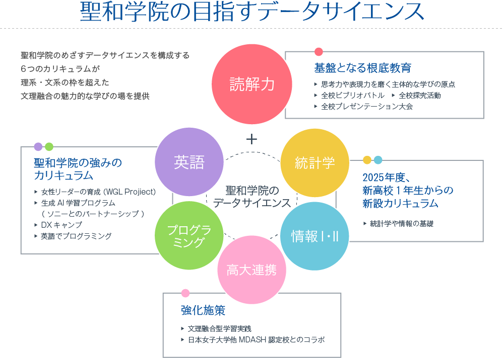 聖和学院は、未来に向けて共に発想・創造する「未来共創力」をテーマに、卒業生が社会で未来を構想する力を育む進路指導を行っています。現代社会で重要視されているコミュニケーション能力やデータ分析力の充実を目標に、2025年度から高校1年生向けに4つの新コースを設置しています。この新しいカリキュラムは、理系・文系を超えた文理融合の学びを提供し、データサイエンスのスキルを身につけることを目指しています。