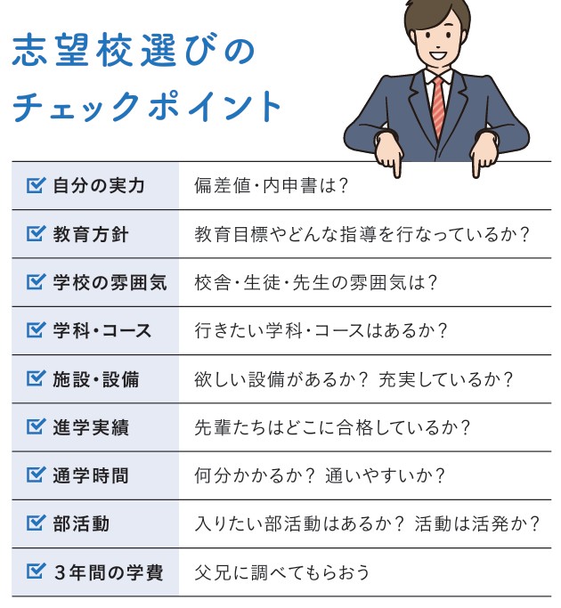 この冊子を手にしたみなさんは、高校に行くことを決めている人だと思います。ではどんな高校に行きたいかを決めているでしょうか。家から通いやすい学校。友達が行く学校。部活ができる学校。楽しそうな学校。専門性がある学校。内申点や偏差値で行ける学校、、、etc。誰にとっても15歳の学校選びは一大イベント。選ぶ理由が1つに絞り込めればいいのですが、いろいろあって当然、後悔しないためには、情報を集め、検討したいことは検討して選ぶことが大切です。ただ高校受験には、推薦入試・一般入試、内申点や偏差値、面接など、受験校を決める時に知っておいた方が良いことがたくさんあり、ただ一生懸命勉強すればいいというわけではありません。しかも少子化の今、募集要項や制度が変わる可能性も高く、学校や塾の先生、親と一緒に調べる方が良いでしょう。さて、よくわからない部分があるから、高校受験は学校の先生と決める。塾の先生と決める。親と決める。これはどれも正しいことですが、大切なことが抜けています。それはまず自分の志望を考えてみるということ。この先の人生は長く、志望は何度変わってもいいのですが、中学という義務教育が終わった後の進路は、自由であるとともに多様。将来自分が進みたい道が少しでも見えているなら、その進みたい道に近づける学校を志望しましょう。高校受験は自分の志望を考えるいい機会です。内申点や偏差値などのこともありますが、高校受験の主役はあなた。あなたがまず将来のことを考え、志望を決めてみてください。まだあなたが中学1.2年生なら、それは1つに絞らなくてもOK。調べたり、聞いたり、体験したりする中で絞っていけばいいのです。きっとまわりの大人は、あなたの志望をかなえるために応援してくれるはずです。