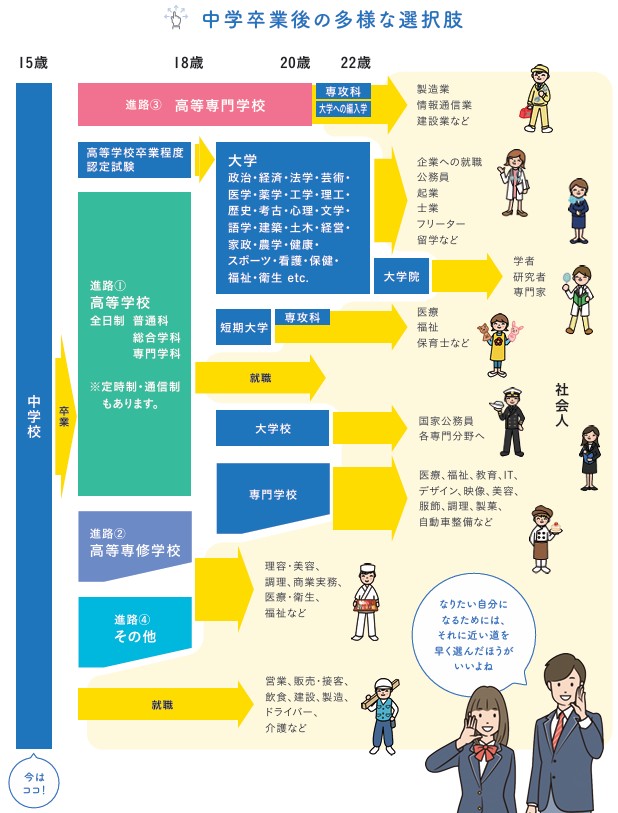 小学校や中学校に受験はなかったのに(公立の場合)、なぜ高校進学に受験があるかといえば、高校は義務教育ではないからです。つまり高校へ行くのは義務ではなく自由。行っても行かなくてもいいのですが、高等教育はその後の人生を豊かにする教育として多くの人(東京都の場合98.9%)が選ぶ教育となりました。そして高等教育は自由な分、その裾野は広く、普通科だけではなく専門的な教育をする学校もあり、多様な選択肢の中から選ぶことができます。