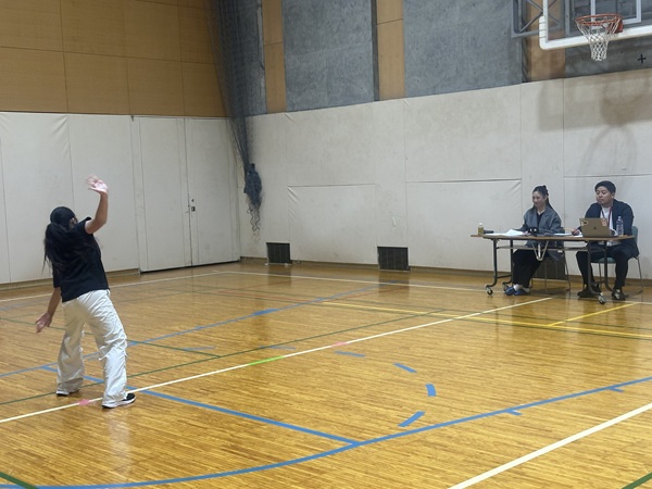 試験会場の体育館は3人同時にパフォーマンスを披露できるようにブースに仕切られ。それぞれダンサーと本校の教員がペアになって採点をしていきます。