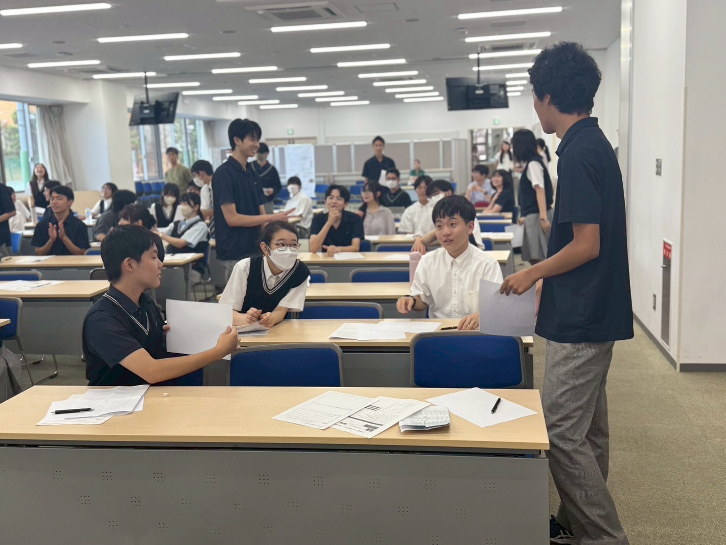 開会式では、1日グループ活動で共にする学校・学年を越えた仲間たちとのチームづくり。まず、グループ単位で自己紹介。自分の得意なこと、プロジェクトや部活動、課外活動などの取り組みを共有し、新たな発見を得るスタートとなりました。アイスブレイクとして、仲間の「好み」や「価値観」をテーマにした予想型コミュニケーション「十人十色ゲーム」を実施。チームメンバー間の信頼関係や協力体制が向上、全員が一体感を持って活動できるようになりました。