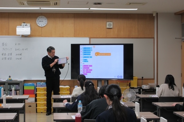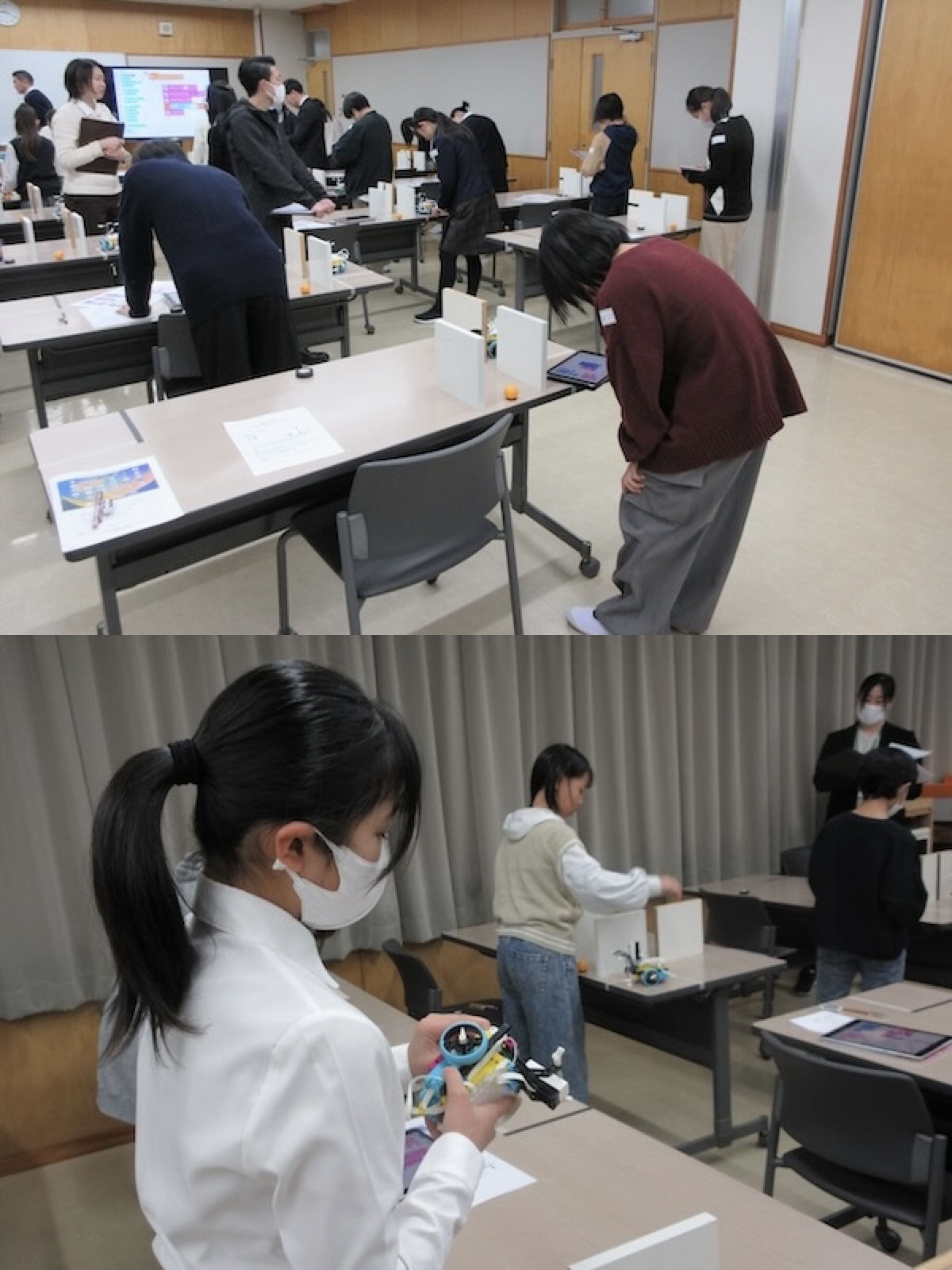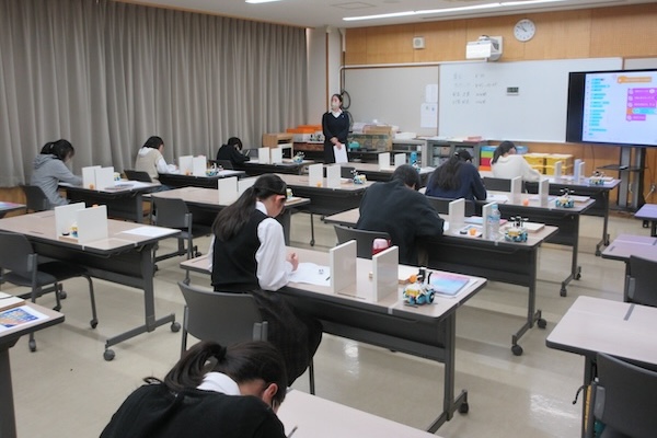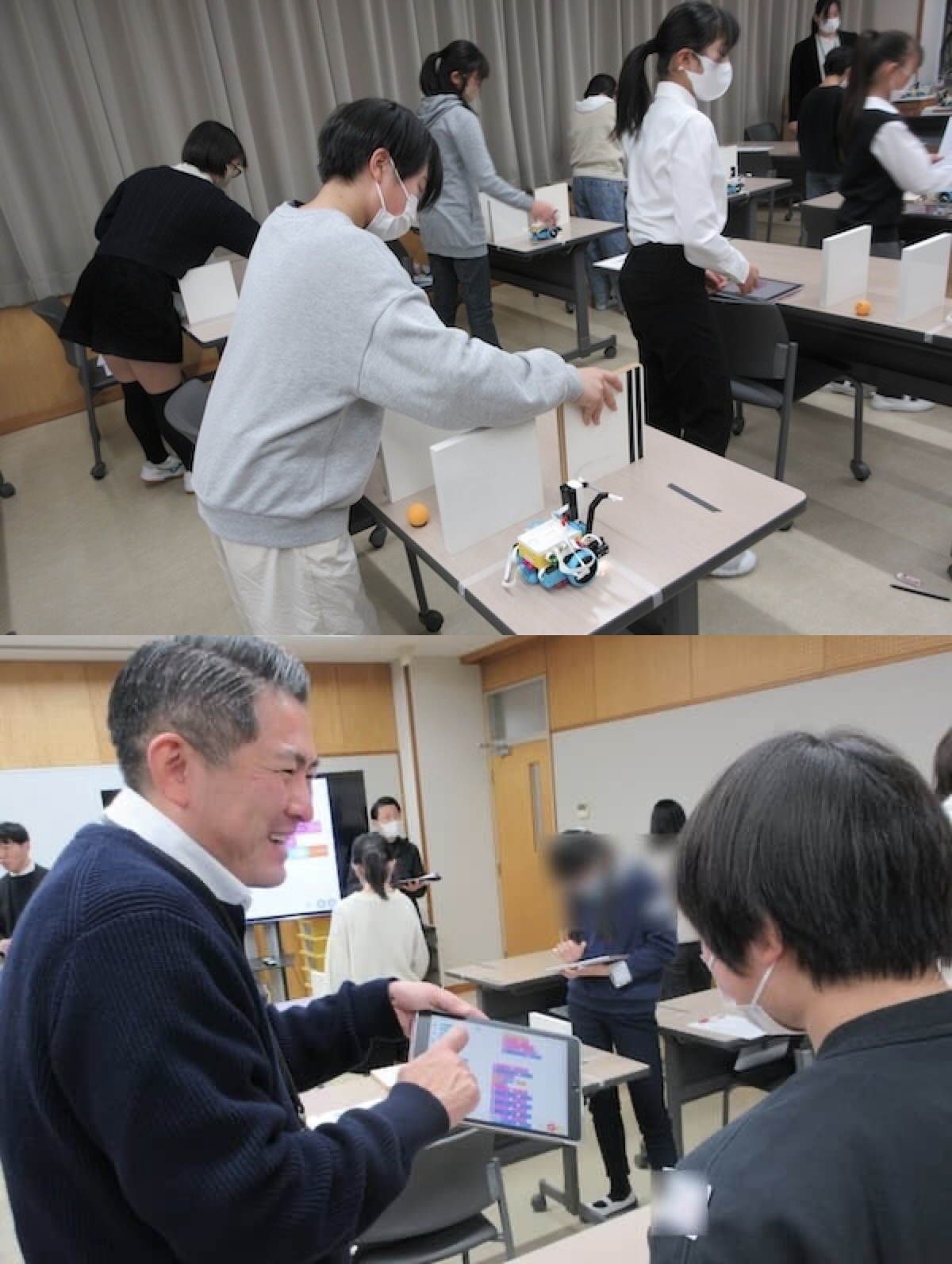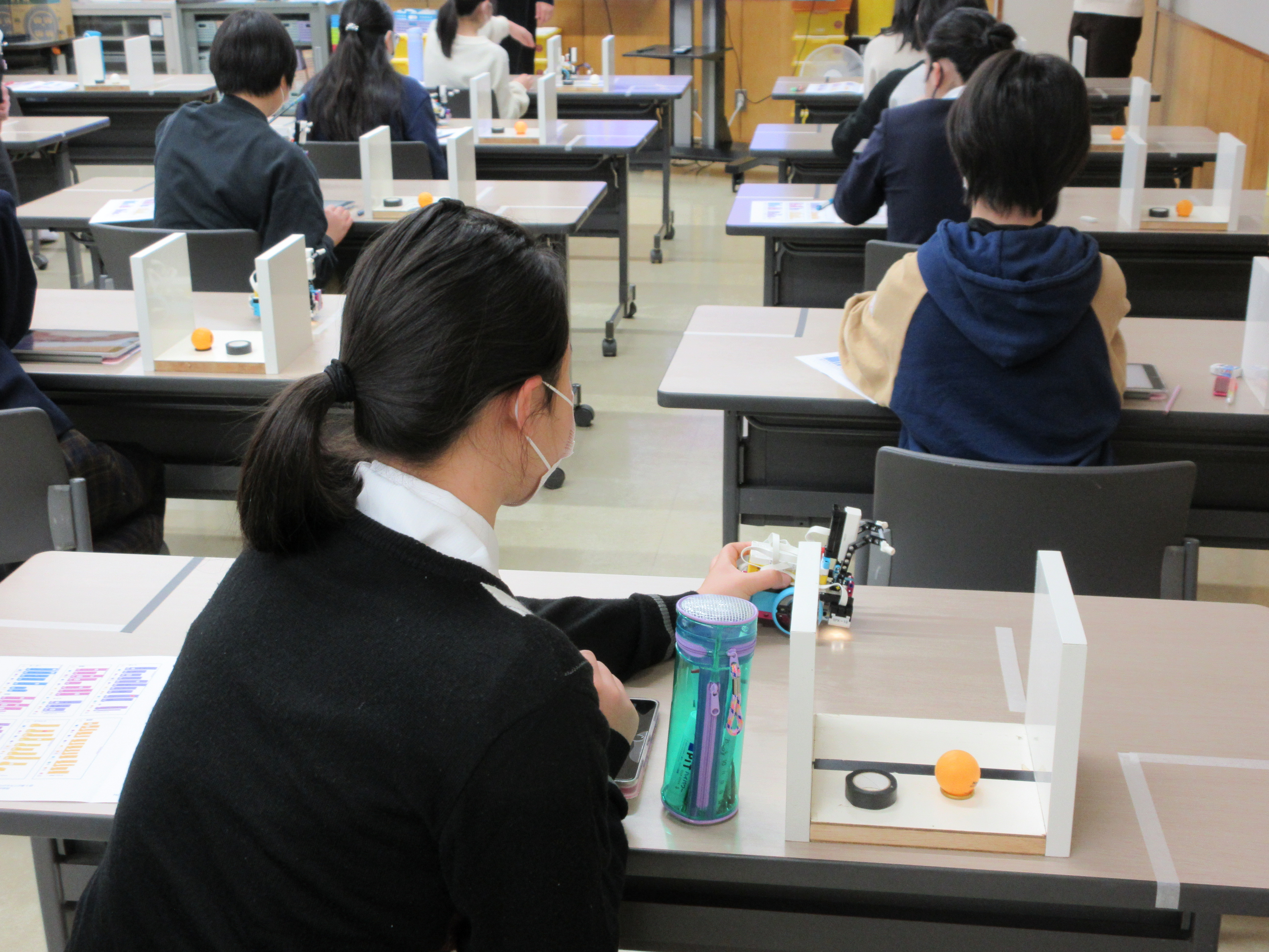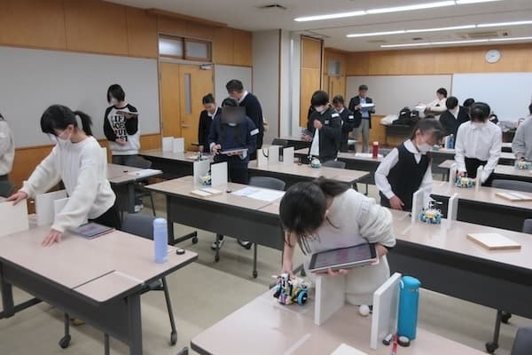 2026年2月1日(日)午前、相模女子大学中学部・高等部(以下、相模女子)にて第1回プログラミング入試が実施されました。8年目を迎えた同入試は、プログラミングスキルの巧拙を競うものではなく、導入授業・実習・プレゼンテーションを通じて「試行錯誤する力」を見極める、ユニークな選抜方式です。今年度は21名の受験生が全員出席し、車型ロボットの課題に真剣かつ楽しそうに取り組んでいました。 8時に開場した受験生控室には、穏やかなBGMが流れていました。受験生たちはここで集合し、8時35分になると試験会場となる教室へ移動します。教室の机の上には、車型ロボットやiPad、ピンポン玉など、試験で使用する教材がすでに用意されていました。荷物を後ろのテーブルに置き、受験番号のシールを左肩に貼って準備完了です。 「試験中もトイレや水分補給は自由です」という先生からのアナウンスに、少し緊張していた受験生たちの表情がやわらぎました。じっと座って取り組む筆記試験とはまったく異なる入試であることが、この一言からも伝わってきます。「リラックスして存分に力を発揮してほしい」という学校側の想いが、会場全体の雰囲気づくりに表れていました。 8時45分、試験開始。最初のパートは約30分間の導入授業です。教壇に立つのは、中学部校長の中間義之先生ご自身。9名の先生方がサポート体制を敷く中、iPadのスクラッチを使ったロボットプログラミングの基本操作が丁寧に解説されました。 カラー印刷の教材プリントも用意されており、スクラッチのブロックの色が見やすいよう配慮されています。中間校長は受験生たちが内容を理解しているか確認しながらコミュニケーションを取り、実習に影響が出ないよう寄り添った言葉遣いで授業を進めていました。受験生たちは熱心にメモを取りながら、気をつけるべきポイントをしっかりとキャッチしている様子です。 授業の途中、ロボットをぐるっと回転させる動作確認では、コマンド通りに動いたロボットを見て、受験生たちから声に出さない驚きと喜びが伝わってきました。最初は緊張感が勝っていた教室も、このあたりから雰囲気が和らぎ、ワクワクした空気に変わっていきます。 忘れてはならないのは、この導入授業も評価の対象であるという点です。講師の話に耳を傾け、必要なことを記録し、理解しようと努めているか。相模女子が大切にする「柔軟な心」──周囲からの助言に耳を傾け、自らの可能性を信じて挑戦する姿勢──がここでも問われています。手を挙げられない受験生にも、先生方が見回りながらさりげなく声をかけてサポートに入っており、どんな受験生でも安心して取り組める環境が整えられていました。 9時15分、いよいよメインパートであるプログラミング実習がスタート。穏やかなオルゴール曲のBGMが流れる中、50分間の課題に取り組みます。 今年の課題は、車型ロボットをスタート地点からゴール地点まで移動させるというもの。ただし3つの条件があります。立てて置いてある板を机から落とさずに動かすこと、ピンポン玉を机の下に落とすこと、そしてカラーセンサーを1回以上使うこと。コース上には固定された板もあり、立てて置かれた板をロボットで倒してから押し出さないとゴールにたどり着けない設計になっています。 さらに難しいのは、ロボットを手で置く際の微妙な角度のずれが結果に影響するという点です。予想通りにはいかないリアルなイレギュラーにどう対応するか──まさに試行錯誤の力が問われます。黒テープをどこに貼りセンサーをどう使うかという自由度もあり、受験生一人ひとりの個性と工夫が見えるポイントでした。 スタートと同時に、iPadですぐプログラミングを始める受験生、立ち上がってコースを眺めながらイメージを膨らませる受験生、まずロボットを動かしてみる受験生、プリントのメモを見返しながらじっくり考える受験生と、アプローチは実にさまざまです。15分ほどで最初の条件をクリアする受験生が現れ、9時46分には早くも全条件を達成した受験生が手を挙げて先生に成果を見せる場面もありました。 ただし、課題をクリアしたらそれで合格、というわけではありません。この入試はプログラミングの完成度を測るものではなく、課題に向き合い試行錯誤を続ける姿勢そのものを評価する入試です。逆に言えば、時間内に課題を完遂できなくても、それだけで不合格になることはありません。 課題をクリアした受験生には、先生から「残りの時間でセンサーをできるだけたくさん使うようプログラムを改造してください」という追加課題が出され、最後まで試行錯誤が続きます。途中でiPadのソフトに不具合が出ても先生がすぐに対応し、ロボットが机から落ちても替えのロボットがすぐ用意されるなど、何年も積み重ねてきた運営のスムーズさが光っていました。 10時5分にプログラミング実習が終了すると、受験生は4グループに分かれ、プレゼンテーショ