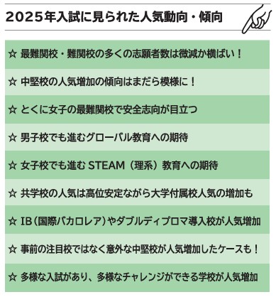 ここでは、今春2025年入試に見られた人気動向を振り返り、“中学入試の変化”のあり方を見据えて、そこにわが子(受験生)の志望校合格へのヒントを探っていきましょう。右のコラムは、「2025年入試に見られた人気動向・傾向」を箇条書きにまとめたものです。ここでお伝えしている人気動向は、本誌や本誌の姉妹誌である『shuTOMO』の誌面でも、これまで様々な角度や切り口でご紹介してきました。そのなかの最初の「最難関校・難関校の多くの志願者数は微減か横ばい!」と、次の「中堅校の人気増加傾向はまだら模様に!」という二つのポイントに着目していただきたいと思います。この「難関校よりも、むしろ中堅の多くの私立中の人気増加が目立つ」という傾向は、ここ数年の首都圏中学入試で、しばらく受け継がれてきたものです。その理由は、結論からいうと「中堅の(多くの)私立中の教育が良くなった(進化した)」ことによります。私立中高一貫校の多くは、文部科学省の『学習指導要領』が、ほぼ10年に一度改訂される度に、自らの教育を見直し、時代の変化やニーズに応じた力を育てるための教育の工夫を重ねてきました。大学入試の変化に対しても同様の対応を重ねてきました。