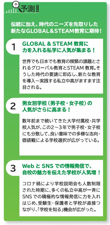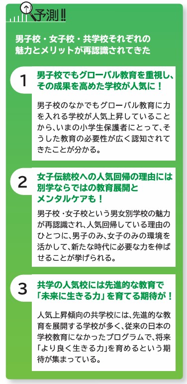 本誌編集部ではこの2年間、『myTYPE』の姉妹誌の『shuTOMO』1月号の特集で、翌年~2年後の中学入試状況を、模試での志望状況など様々なデータと情報から予測してきました。ここでは、今春2025年1月号で予測した「2025~2027中学入試大予測」という特集のなかでご紹介した、人気動向や変化の傾向のコラムを再びご紹介しておきます。幸い、これらの予測(予想)は、ほぼその通りの傾向が実現したといっても良い状況になっていまが、それでも、予想通りにはならない新たな変化が実際の入試では生じることがあります。左ページの「公立中高一貫校と私立中の併願者と私立中の新タイプ入試はさらに増加へ!」という予測は、まさにその通りになりましたが、たとえば上記の左段のコラムのなかの、2「男女別学校(男子校・女子校)の人気がさらに高まる!」というポイントは、私たちの予想とは違って、「共学校・大学付属校への人気回帰」の動向が生まれてきています。受験生の保護者の情報収集のアンテナが、それほど敏感に時代の空気や変化を感じ取っているということなのかもしれません。それでも、受験生と保護者の皆さんには、そうした変化(進化)のなかにこそ、わが子が実り多い受験体験をできるための新たな突破口やチャンスを見出してもらいたいのです。