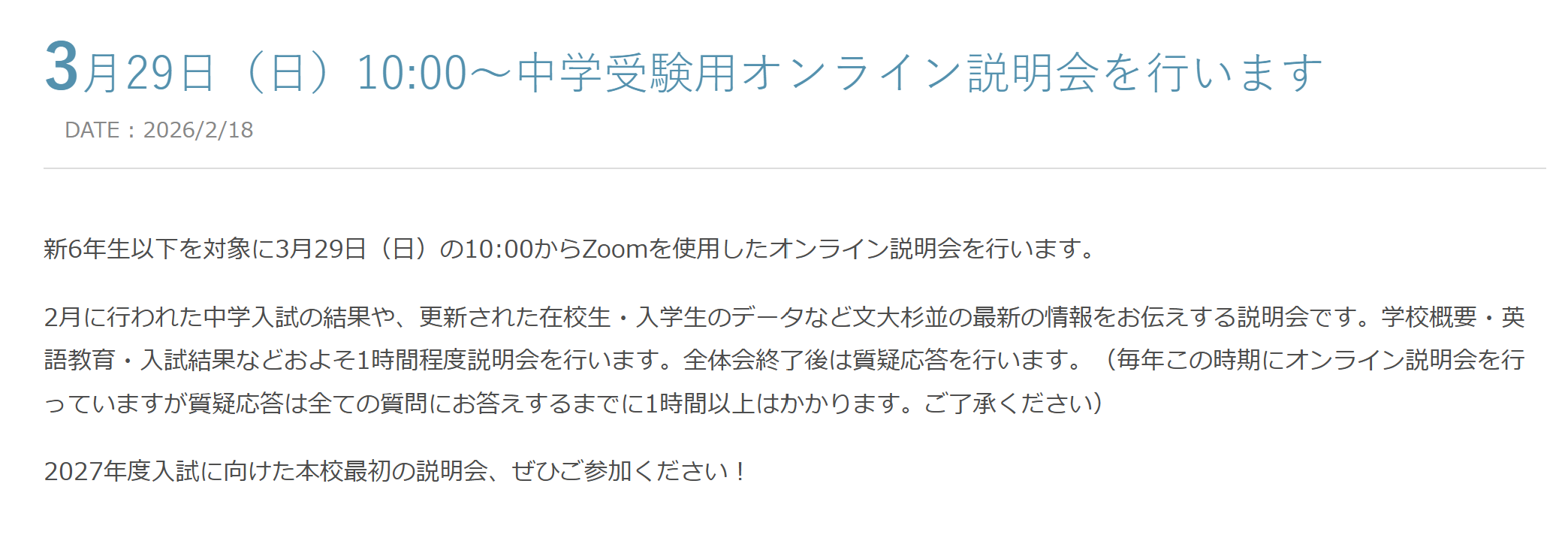 内容:2026年入試結果、文大杉並の最新情報、学校概要、英語教育、質疑応答など