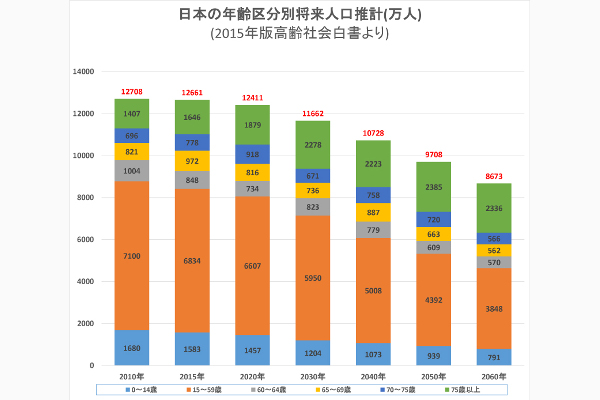 昨年(2015年)の出生数は約100万8千人。1974年には200数万人いたことからすれば半減しています。今年はついに100万人を切るのではないかと言われています、そして、今年から30歳になる人たちの人口が年を追うごとに急激に減少を始めます。つまり子どもを産む女性がどんどんと減っていくわけですから出生率を大きく上げなければ出生数はどんどん減っていくことになります。 これからまだまだ子どもの数は減っていくことでしょう。となると、社会で働く人も少なくなります。いわゆる生産年齢人口はこれからどんどん減っていくことになります。また、国の人口の減少は、国内の需要が減ることになりますから、国力の減退にも繋がりかねません。