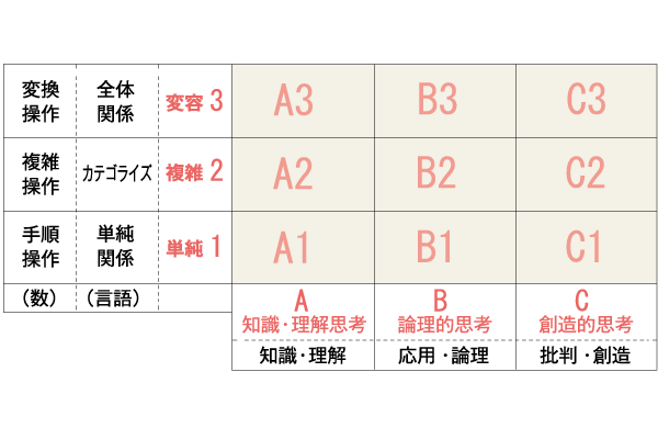 知識や思考力という概念に何らかの枠組みを与える試みは、過去に数多くなされてきた。有名なのは1956年にB.S.ブルームらが開発した「教育目標分類学(通称ブルーム・タキソノミー)」である。もともとは大学の試験問題を作成・評価するに当たって、関係者の共通言語をつくり認識をそろえる目的であったが、それが教育目標を示すのにも活用されるようになった。